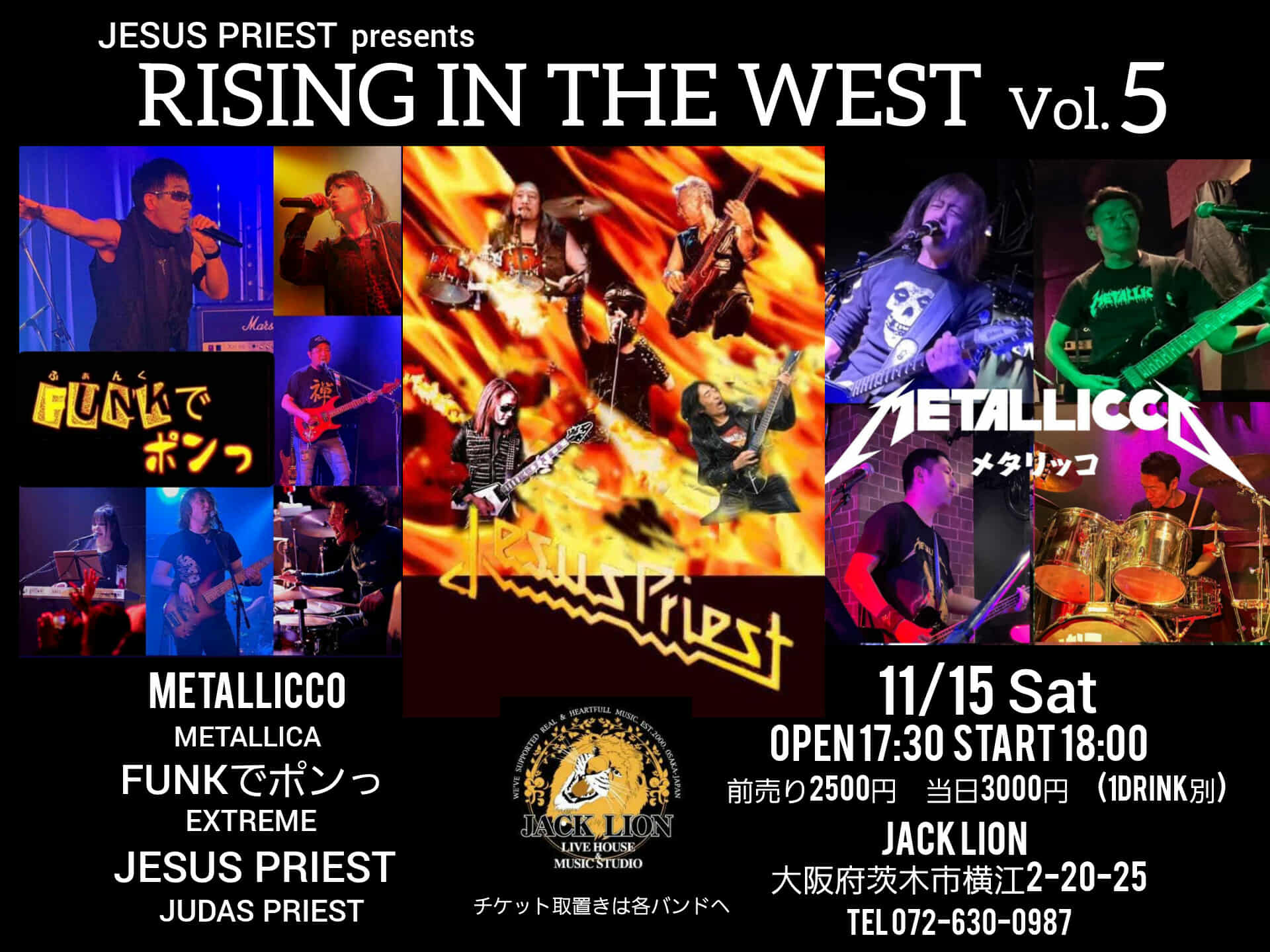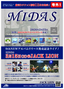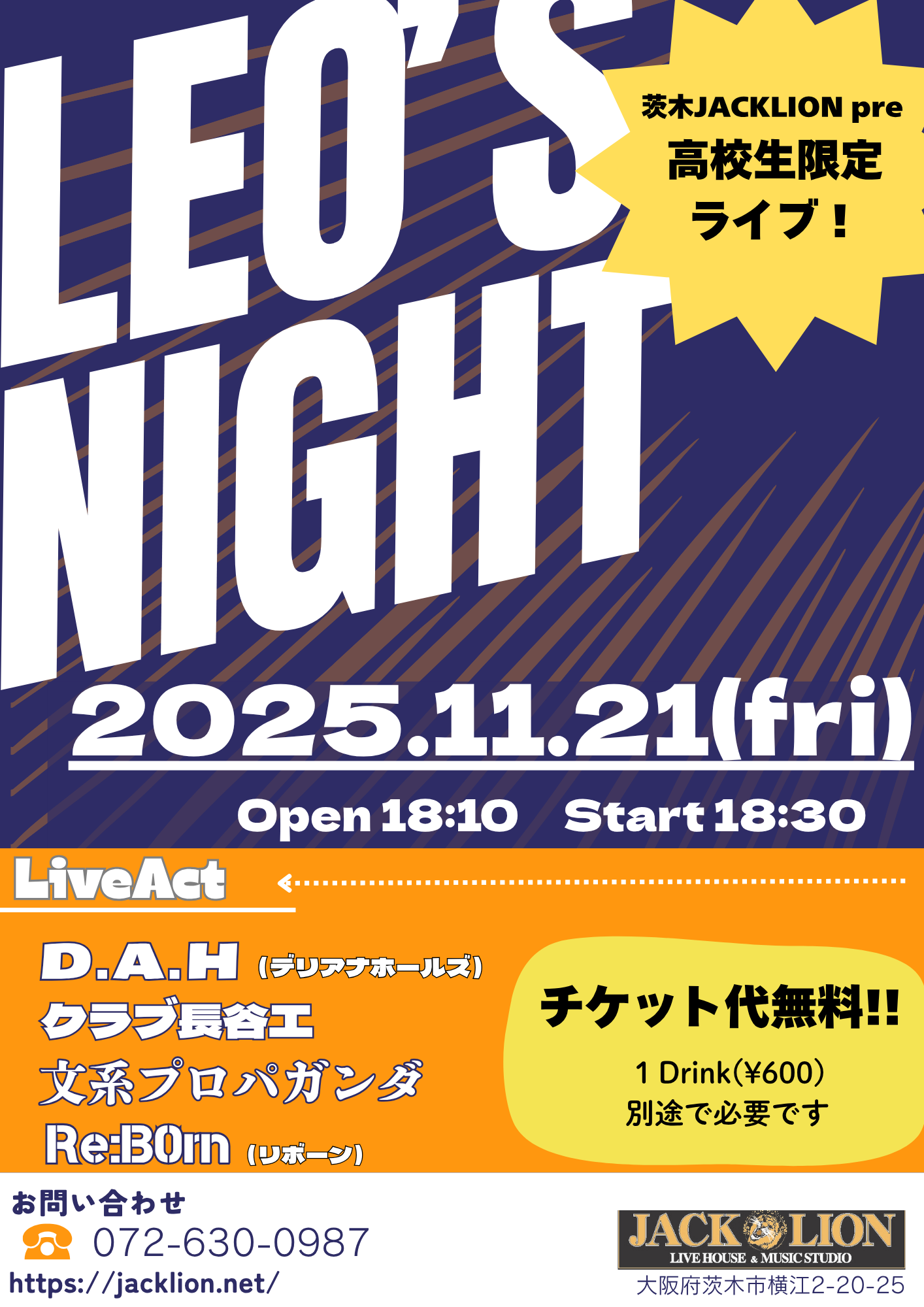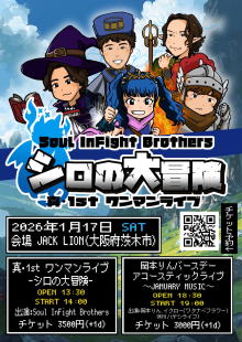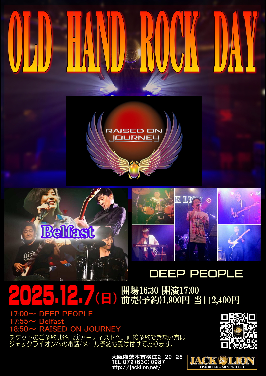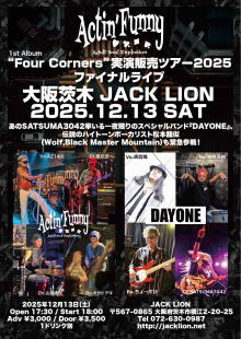 | ライブ・スケジュール ご入場時にチケット代の他に1ドリンク代として600円が必要となります。(ドリンクチケットをお渡しします) ご入場時のドリンク代は一律600円です。また600円以上の商品はドリンクチケット+現金にてご購入いただけます。 2杯目からそれぞれのメニュー価格(ソフトドリンク300円など)となります。 【要学生証】学割は当日受け付けで学生証の提示で学割価格になります。 また、各出演アーティストへの取り置きが指定されてるライブで直接連絡が不可能な方は、ジャックライオンへのお電話 またはメールにて予約を承ります。詳しくはメール予約のページをご覧ください。 ■開場時間に合わせてお越しください。早くからのご来店はどうかお控えくださるようお願いいたします。 ■37.5度以上の発熱や体調不良時には来場をお控えください。 12月 ◆2025/12/6(土) びっくりギターズ30周年 pre-event ![]() 出演:roll back / Spicy Honey Milk /リッチー坂本's ビートルズトリオ / 谷川昇二 / 江口マルムスティーン 開場16:30 開演17:00 前売(予約)2,400円 当日2,900円 ※大学・専門学生以下前売(予約)1,400円 当日1,900円 要学生証 ※父兄同伴の小学生以下入場無料 ■このライブのチケットのご予約はジャックライオンホームページ「チケット予約」よりメールでの申し込みで受付けておりますが、出演者取り置き予約も受け付けております。 ■ご入場順はご来店順です。 ■テーブル&イスあり。ご予約人数により客席のセッティングが変わります。 ●詳細 ●チケット予約へ ◆2025/12/7(日) OLD HAND ROCK DAY ![]() clickして拡大 出演:RAISED ON JOURNEY / DEEP PEOPLE / Belfast 開場16:30 開演17:00 前売(予約)1,900円 当日2,400円 ※父兄同伴の小学生以下入場無料 ■このライブのチケットは各出演者への取り置き予約で受け付けております。直接連絡が不可能な方は、ジャックライオンへのお電話 072-630-0987 または メール にて予約を承ります。 ■ご入場順はご来店順です。 ■テーブル&イスあり。ご予約人数により客席のセッティングが変わります。 ◆2025/12/10(水) びっくりギターズこの日で30年!Anniversary Live ![]() 出演:MASSIVE FUNCTION / マキポン / Indian Popgun 開場18:30 開演19:30 前売(予約)3,000円 当日3,500円 ※大学・専門学生以下前売(予約)1,400円 当日1,900円 要学生証 ※父兄同伴の小学生以下入場無料 ■このライブのチケットのご予約はジャックライオンホームページ「チケット予約」よりメールでの申し込みで受付けておりますが、出演者取り置き予約も受け付けております。 ■ご入場順はご来店順です。 ■テーブル&イスあり。ご予約人数により客席のセッティングが変わります。 ●詳細 ●チケット予約へ ◆2025/12/13(土) Actin’Funny 1st Album "Four Corners" 実演販売ライブ2025 in OSAKA Ibaraki Jack Lion ![]() clickして拡大 出演:Actin’Funny / DAYONE 開場17:30 開演18:00 前売り(予約)3,000円 当日3,500 ■このライブのチケットのご予約はジャックライオンホームページ「チケット予約」よりメールでの申し込みで受付けておりますが、出演者取り置き予約も受け付けております。 ■ご入場順は開場時ジャックライオンメール予約の方優先⇒バンド取り置き 開場後はご来店順です。 このライブに詳細及びお問い合わせは FB Actin’Funny https://m.facebook.com/actinfunny106/ ●ジャックライオンでのチケット予約へ ◆2025/12/14(日) MonkeyFlip LIVE2025~師走の祭典~『MonkeyFlip G1 CLIMAX』 出演:MonkeyFlip 開場14:15 開演15:00(ゴング) 前売(予約)2,400円 SOLD OUT 只今キャンセル待ち受付となっております ■このライブのチケットのご予約はジャックライオンホームページ「チケット予約」よりメールでの申し込みで受付けております。(予約はメールのみとなります。電話での予約は受け付けておりませんのでご注意ください) ■入場順はチケットメール予約番号順(開場時お越しのジャックライオン一般チケット予約の方が入場後、バンド受付の入場)となります。予約番号をお持ちの方は開場時間10分前を目安にお越しください。開場以降はご来店順ご入場いただきます。 ●詳細 ●チケット予約へ ◆2025/12/19(金) 加納秀人ソロライブ&ジャム ソロの他オープニングアクトとのセッションやお客さんとのジャムOK!! ぜひ楽器を持ってご来場ください。※会場にも用意いたします。 ![]() 出演:加納秀人(Gt,Vo/外道) オープニングアクト:ゆゑん 開場19:00 開演19:30 前売(予約)4,500円 当日5,000円 ※大学・専門学生以下前売(予約)2,400円 当日2,900円 要学生証 ■このライブのチケットのご予約はジャックライオンホームページ http://jacklion.net/ 「チケット予約」よりメールでの申し込みで受付けますが、オープニングアクト出演者への取り置き予約も受付けます。 ■ご入場順はご来店順です。 ■テーブル&イスあり。ご予約人数により客席のセッティングが変わります。 ●詳細 ●チケット予約へ ◆2025/12/20(土) Kumi Fes LIVE IN OSAKA 出演:安達久美(G) with HOT FLASH MAKER / 撫子楽団 / さぼゅ~る ※全バンドに安達久美が入ります 開場18:00 開演18:30 前売(予約)3,500円 当日4,000円 