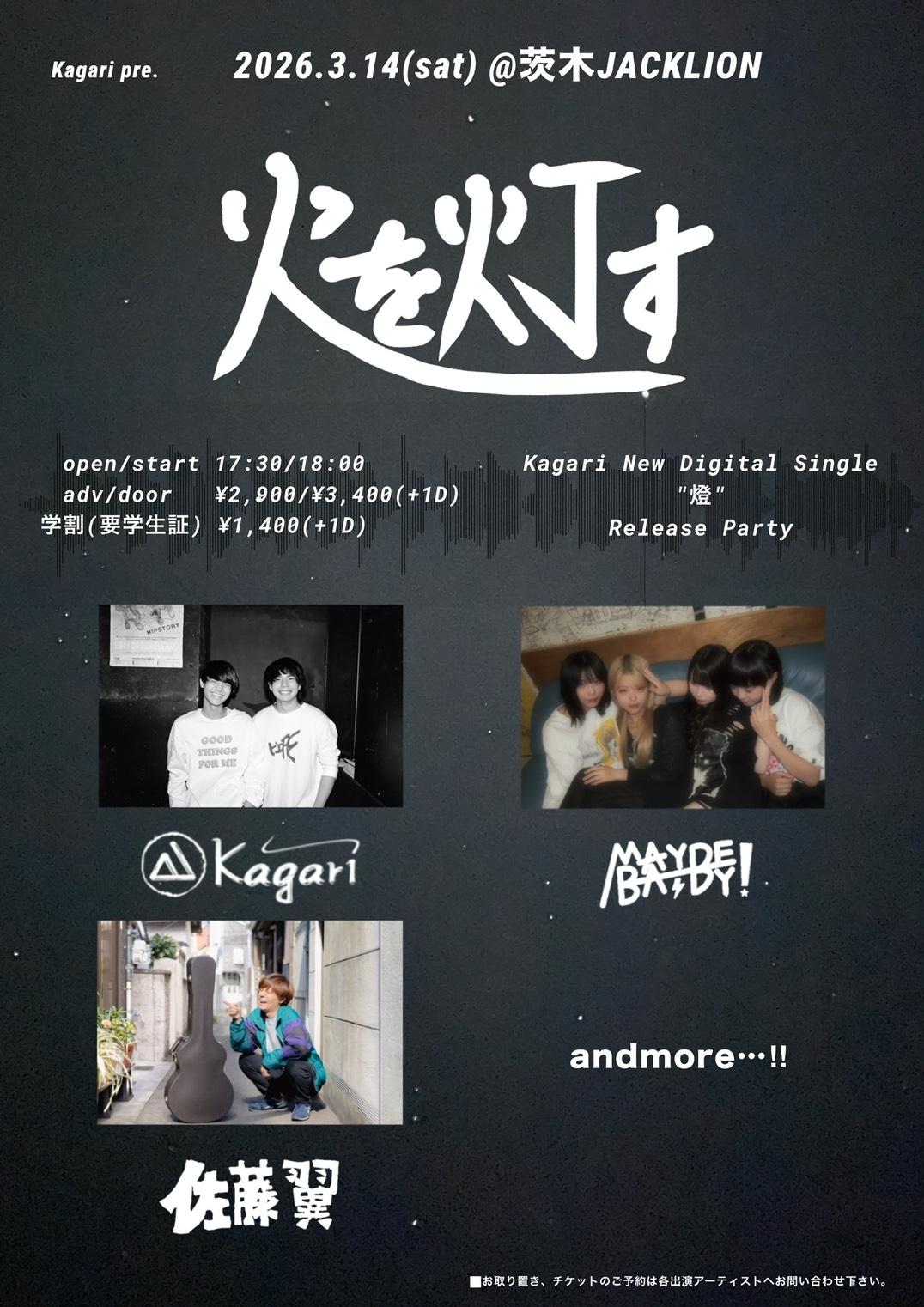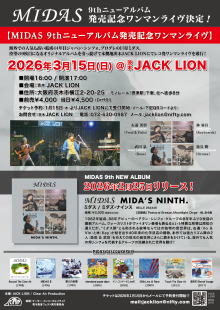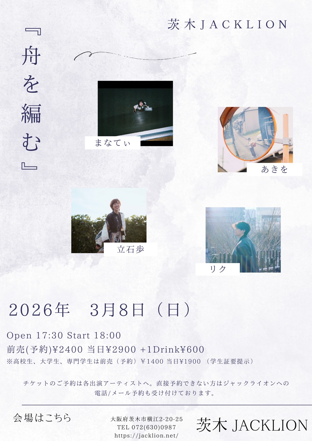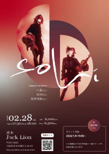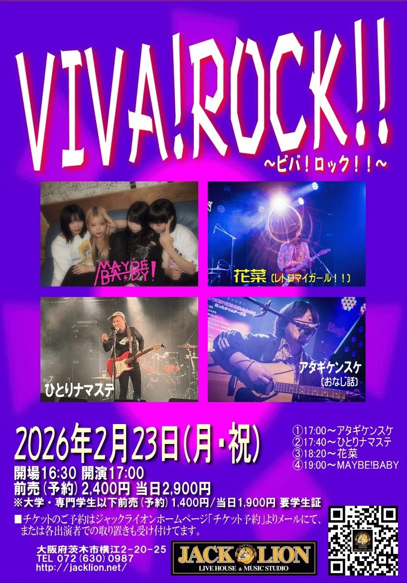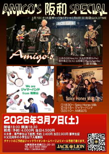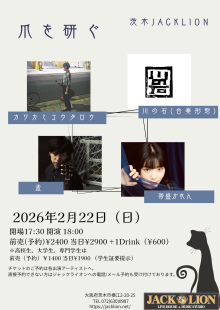 | ライブ・スケジュール ご入場時にチケット代の他に1ドリンク代として600円が必要となります。(ドリンクチケットをお渡しします) ご入場時のドリンク代は一律600円です。また600円以上の商品はドリンクチケット+現金にてご購入いただけます。 2杯目からそれぞれのメニュー価格(ソフトドリンク300円など)となります。 【要学生証】学割は当日受け付けで学生証の提示で学割価格になります。 また、各出演アーティストへの取り置きが指定されてるライブで直接連絡が不可能な方は、ジャックライオンへのお電話 またはメールにて予約を承ります。詳しくはメール予約のページをご覧ください。 ■開場時間に合わせてお越しください。早くからのご来店はどうかお控えくださるようお願いいたします。 ■37.5度以上の発熱や体調不良時には来場をお控えください。 2月 ◆2026/2/1(日) 『ナイスシュウト!』 出演:ユタカ / 奥村由希 / 美侑 / 佐藤秀人 ◆2026/2/8(日) ガラパゴス・デラックス 出演:玉井慎二(gangsters) / 吉田このみ / 谷川昇二 / さばちゃん / 北山愛莉 ◆2026/2/14(土) 佐藤研二SOLOベース~一晩・一人・ベース1本勝負!~ 「SOLOIST19発売記念ライブツアー」 出演: 佐藤研二(B,Vo) ◆2026/2/15(日) RENTAL 梅花女子大学フォークソング部 ◆2026/2/21(土) 時代を変える旅に出よう ![]() 出演:山本新 / メトロロ(from 和歌山) / とおぼえ(from 京都) / torobi 開場17:00 開演17:30 前売(予約)2,400円 当日2,900円 ※大学・専門学生以下前売(予約)1,400円 当日1,900円 要学生証 ※父兄同伴の小学生以下入場無料 ■このライブのチケットのご予約はジャックライオンホームページ「チケット予約」よりメールでの申し込みで受付けますが、出演者取り置き予約も受け付けます。 ■ご入場順はご来店順です。 ■テーブル&イスあり。ご予約人数により客席のセッティングが変わります。 ●詳細 ●チケット予約へ ◆2026/2/22(日) 「爪を研ぐ」 ![]() clickして拡大 出演:カワカミコウタロウ / 孟 / 帯盛かれん / 川の石(合奏形態) 開場17:30 開演18:00 前売(予約)2,400円 当日2,900円 ※大学・専門学生以下前売(予約)1,400円 当日1,900円 要学生証 ■このライブのチケット予約は各出演アーティストへ。また出演アーティストに直接連絡できない方はジャックライオンへの電話/メール予約も受け付けます。 ■ご入場順はご来店順です。 ■テーブル&イスあり。ご予約人数により客席のセッティングが変わります。 ◆2026/2/23(月・祝) VIVA!ROCK!! ![]() clickして拡大 出演:MAYBE!BABY / 花菜(レトロマイガール!!) / ひとりナマステ / アタギケンスケ(おなじ話) 開場16:30 開演17:00 前売(予約)2,400円 当日2,900円 ※大学・専門学生以下前売(予約)1,400円 当日1,900円 要学生証 ※父兄同伴の小学生以下入場無料 ■このライブのチケットのご予約はジャックライオンホームページ「チケット予約」よりメールでの申し込みで受付けますが、出演者取り置き予約も受け付けます。 ■ご入場順はご来店順です。 ■テーブル&イスあり。ご予約人数により客席のセッティングが変わります。 ●チケット予約へ ◆2026/2/28(土) soLi ![]() 出演:soLi メンバー:ISAO(Gt) / 星野沙織(Vn) Support members:仁耶(G) BOH(B) 原澤秀樹(Dr) 開場17:30 開演18:00 前売(予約6,000円 当日6,500円 ※ファンクラブ先行予約あり ■このライブのチケットのご予約はジャックライオンホームページ「チケット予約」よりメールでの申し込みで受付けます。 ■ご入場順はファンクラブ先行予約番号順⇒;ジャックライオン一般チケット予約番号順です。 ■テーブル&イスあり。ご予約人数により客席のセッティングが変わります。 ●詳細 ●チケット予約へ 3月 ◆2026/3/1(日) soLi×TONERICO×D_Drive Jumbo Jomboree Japan in OSAKA ![]() 出演:soLi / TONERICO / D_Drive 開場16:00 開演17:00 【①プレミアチケット15,000円 受付終了 【②一般チケット特典付き8,000円(申し込みはお一人様2枚まで)】 【③一般チケット6,500円(申し込みはお一人様2枚まで)】 ※②と③のメール予約受付開始は1月22日(木)20時ちょうどからとなります。(PC/スマホの時計を参照して時間厳守でお願いいたします) ■このライブのチケットのご予約はジャックライオンホームページ「チケット予約」よりメールでの申し込みで受付けます。 ■ご入場順は①プレミアチケット⇒②一般チケット特典付き受付番号順⇒③一般チケット受付番号順です。 ■テーブル&イスあり。ご予約人数により客席のセッティングが変わります。 ●詳細 ●チケット予約へ ◆2026/3/7(土) AMIGO'S 阪和SPECIAL ![]() 出演:AMIGO'S / ジャマーバンド / Spicy Honey Milk 開場18:00 開演18:30 前売(予約)4,000円 当日4,500円 ※大学・専門学生以下前売(予約)2,400円 当日2,900円 要学生証 ※父兄同伴の小学生以下入場無料 ■このライブのチケットのご予約はジャックライオンホームページ「チケット予約」よりメールでの申し込みで受付けますが、出演者取り置き予約も受け付けます。 ■ご入場順はご来店順です。 ■テーブル&イスあり。ご予約人数により客席のセッティングが変わります。 ●詳細 ●チケット予約へ